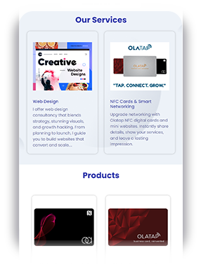 Olatap helps you simplify the way you connect with clients. Share your profile in a tap, let people book meetings instantly, and present your brand with a clean, modern experience — no friction, no forms.